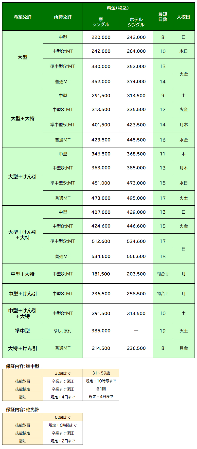 大型車の宿泊プラン/入校カレンダー/料金表